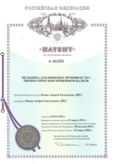 Меланжер содержит опорную раму, с размещенным на ней мотор-редуктором и устройством выгрузки, модулем измельчения, состоящим из емкости с гранитным диском в основании и гранитными валками, каждый из которых установлен на валах, а также пневматического устройства прижима гранитных валков.